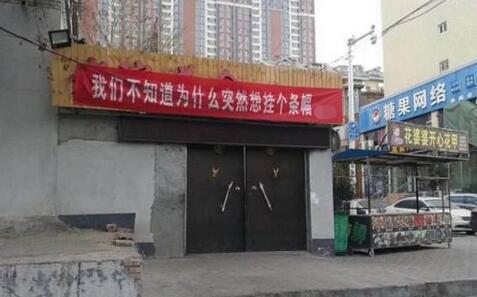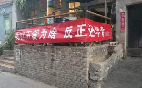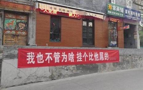 11月24日,在河南新鄉(xiāng)市東大街上,一家飯店的門頭上掛出一個條幅,內(nèi)容是“我們不知道為啥,突然想掛個條幅”。隨后其他商家也紛紛跟進,開始了一場幽默的“條幅大戰(zhàn)”。大家相互配合,圍繞第一個條幅的內(nèi)容向外延伸,腦洞大開。條幅的內(nèi)容語氣都比較幽默,讓人看了忍不住就想笑。商家的神創(chuàng)意成功引起了路過市民的注意。還有市民專門跑到這條街上來看熱鬧。