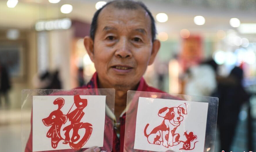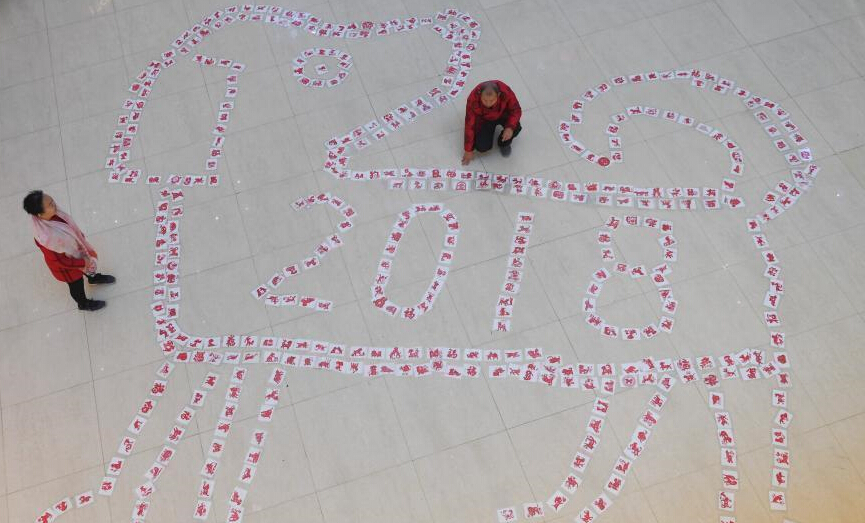 12月26日,濟南民間剪紙藝人用數(shù)百只形態(tài)各異的剪紙“狗”拼“瑞狗迎新”圖。圖為濟南67歲剪紙藝人徐建剪2018只“旺旺狗”迎新年。