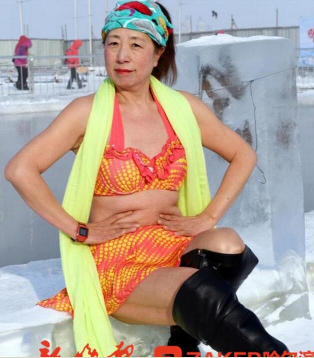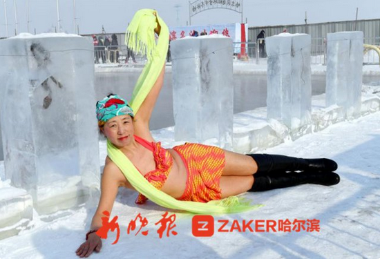 她早已把冬泳池四周當(dāng)成了她的T臺(tái)秀場(chǎng),對(duì)向自己投來(lái)的驚異目光的人,她會(huì)主動(dòng)與之握手,用微笑和禮貎的問(wèn)侯回敬?吹酵鈬(guó)友人她還用英語(yǔ)或俄語(yǔ)向他們問(wèn)好。在她的帶動(dòng)下,冬泳場(chǎng)沸騰了,游客爭(zhēng)相與她一起互動(dòng)、拍照、歡呼,甚至有游客為了跟她貼身拍照偷溜進(jìn)內(nèi)場(chǎng)。她一會(huì)兒坐在冬泳池旁的冰墩上,一會(huì)爬到江面的雪堆上讓游客盡情地拍照。爬冰臥雪,一拍就是半個(gè)多小時(shí)!