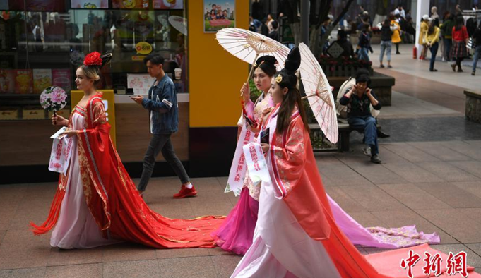 3月30日,重慶觀音橋步行街上幾位美女身著古裝玩穿越。據(jù)悉,她們這樣的裝扮是為了參加重慶一景區(qū)的宣傳活動(dòng),在鬧市為景區(qū)文化進(jìn)行宣傳。圖為幾位美女身著古裝穿越步行街。