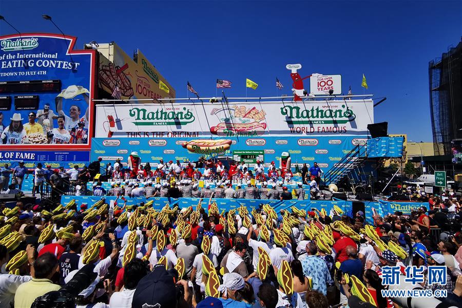 7月4日,在美國紐約康尼島,人們觀看吃熱狗大賽。 當(dāng)日,美國紐約康尼島舉行一年一度的吃熱狗大賽。在男子組比賽中,來自加州的喬伊·切斯特納特10分鐘內(nèi)吃下71個熱狗衛(wèi)冕成功。在女子組比賽中,三木須藤10分鐘內(nèi)吃下31個熱狗,連續(xù)第六次贏得冠軍。