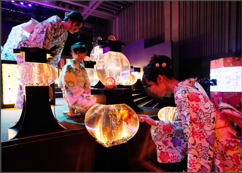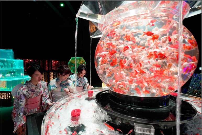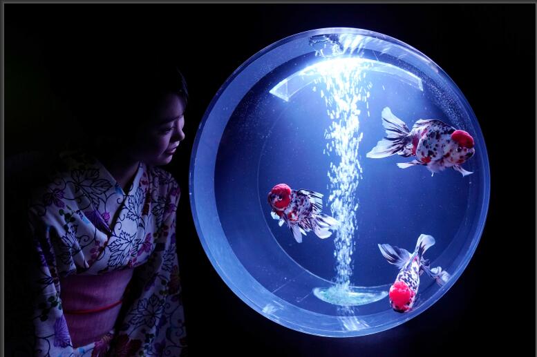2019年7月4日,日本東京,Art Aquarium 2019 金魚藝術(shù)展舉行,身穿夏季和服的女孩們?cè)诶_紛的光影中觀賞一萬(wàn)多條五彩的金魚。