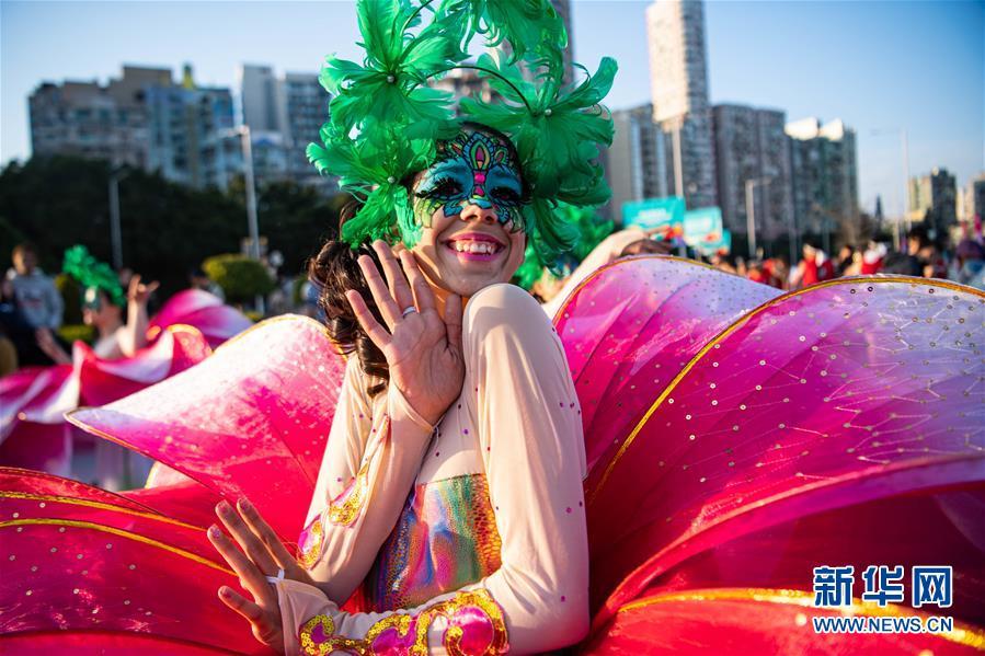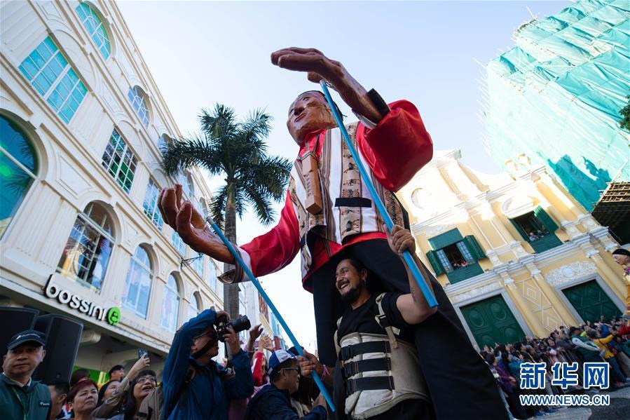 12月8日,表演者在“2019澳門國(guó)際幻彩大巡游”活動(dòng)上與觀眾互動(dòng)。 當(dāng)日,慶祝澳門回歸祖國(guó)二十周年“2019澳門國(guó)際幻彩大巡游”舉行。