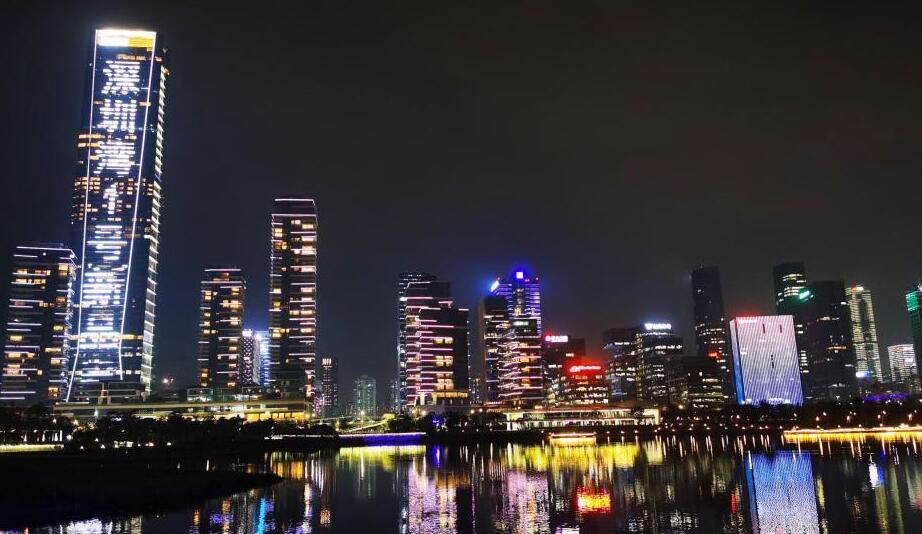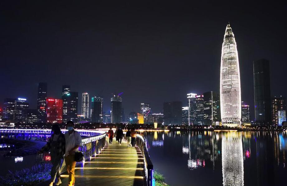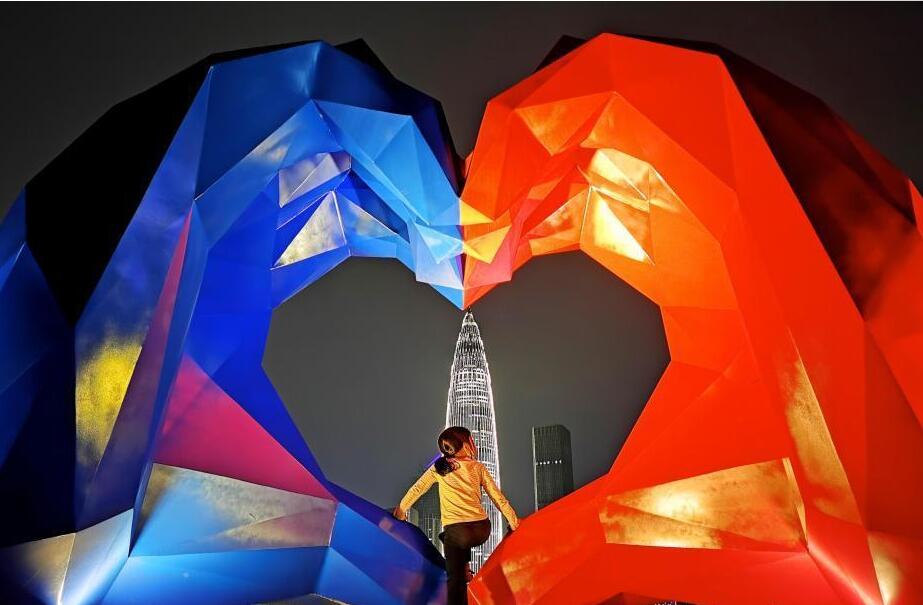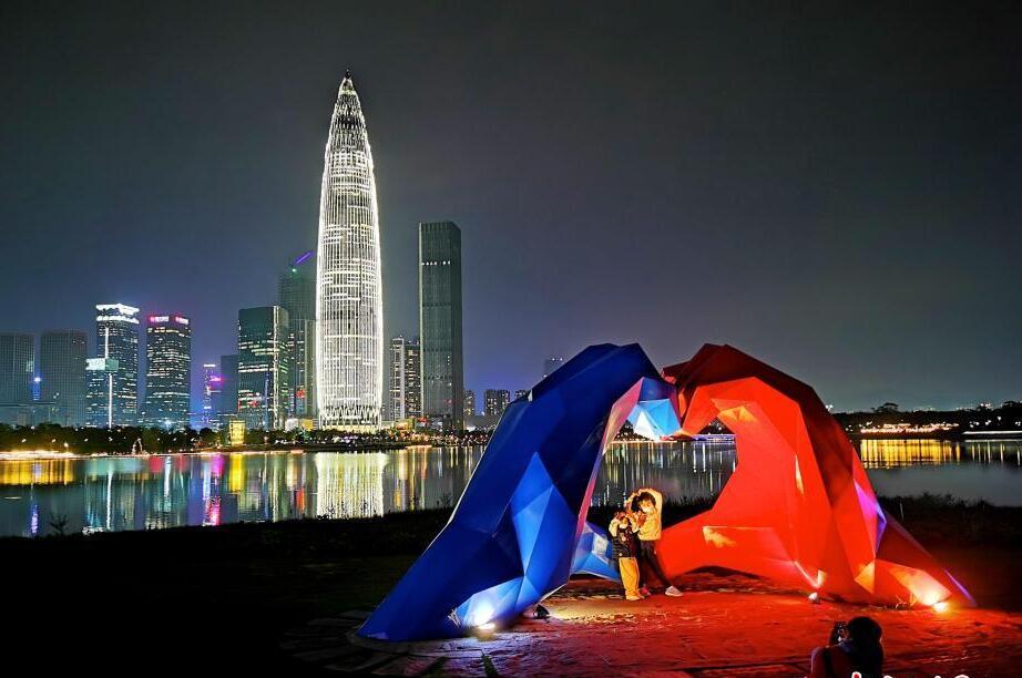 廣東深圳人才公園的“愛心”雕塑與地標(biāo)建筑“春筍”交相輝映,燈光璀璨夜色美。