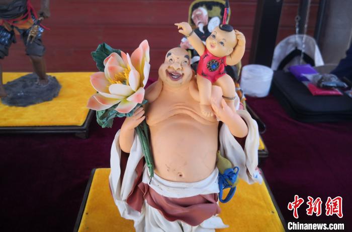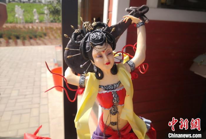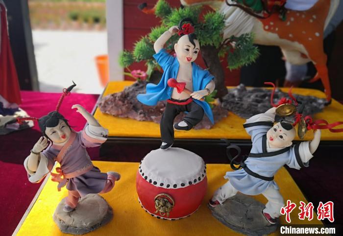面塑孩童敲鑼打鼓場景,生動逼真。 劉玉桃 攝 美女起舞、孩童玩耍、白胡子老爺爺搖扇休息……甘肅白銀一鄉(xiāng)村旅游景區(qū),“90后”李思瑤現(xiàn)場捏面塑,人物、花鳥魚蟲等作品栩栩如生,造型多變,吸引游客觀賞購買。